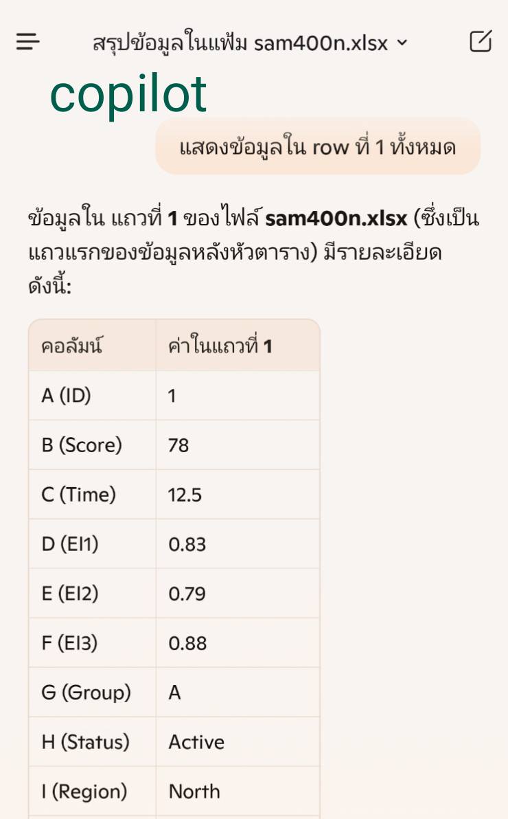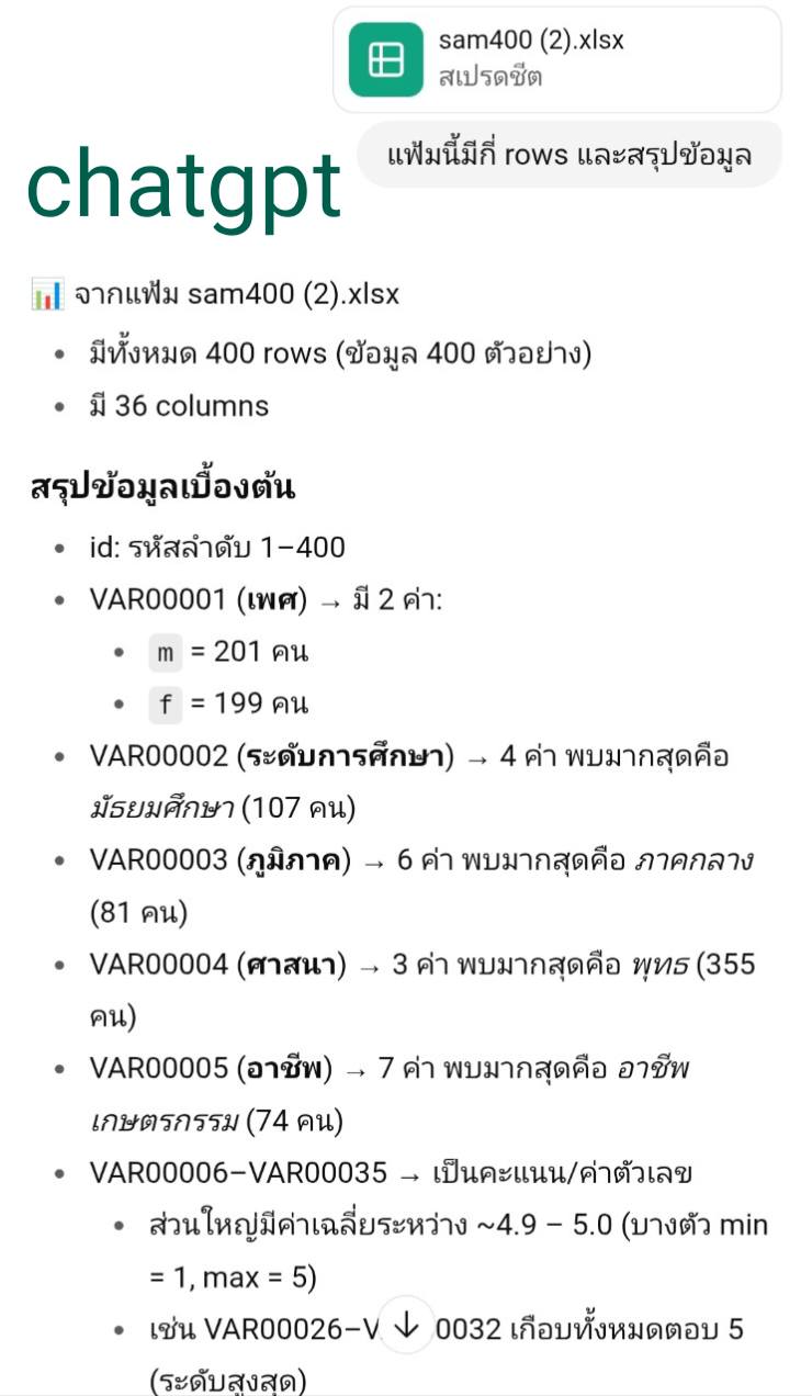 การประมวลผลข้อมูลจากแฟ้ม excel ารประมวลผลข้อมูลจากแฟ้ม excel พบว่า เอไอ หลายตัว รับแฟ้ม xlsx ได้ แล้วประมวลผลข้อมูลใน sheet ได้อย่างถูกต้อง จึงสร้างตัวอย่างข้อมูล 400 (sam400) รายการ แล้วส่งให้ A.I. ประมวลผล ได้แก่ chatgpt, perplexity, gemini, you, copilot ได้ผลดังในภาพ